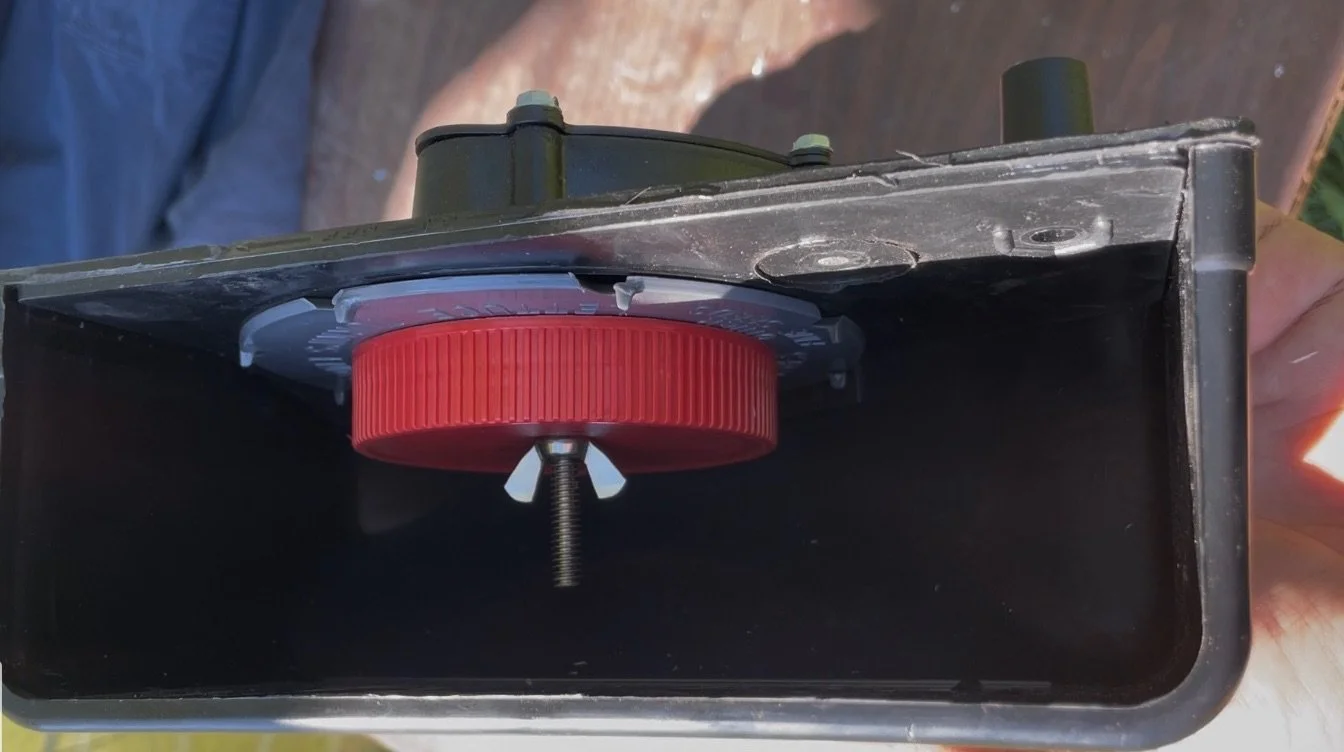 The peanut butter lid in the hopper of the Earthway. We would later add some wood to stiffen it up even more.