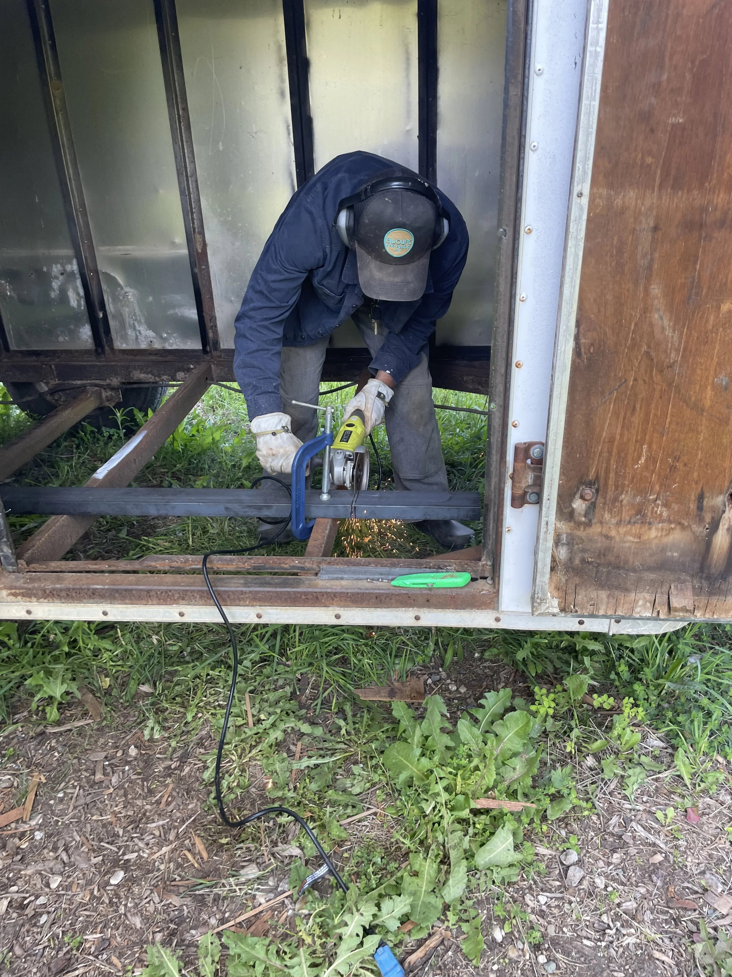 Zach cutting some metal for the floor in the trailer. As you can see it’s a bit crusty!