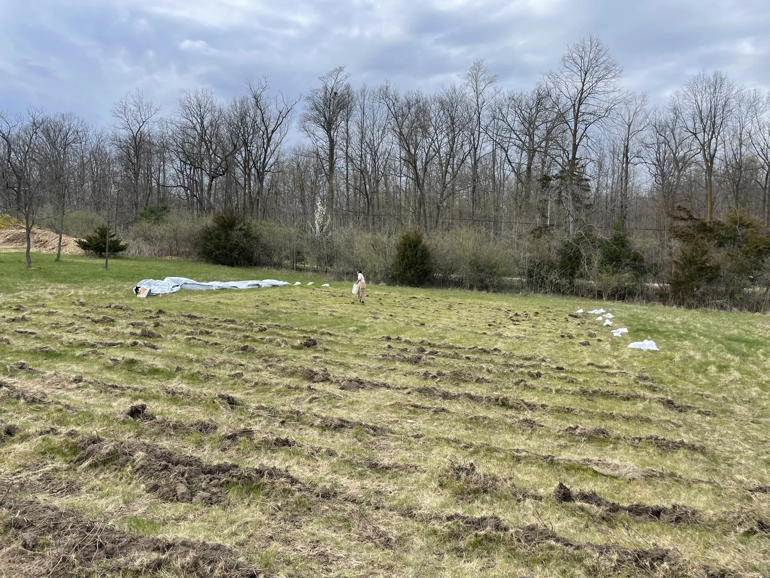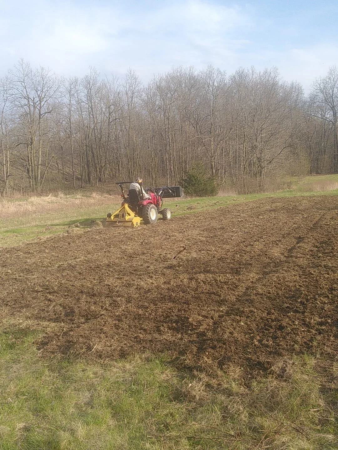 The majority of our time was spent shaping and composting our beds. The growing area for the farm is going to be broken up into four “blocks”. Each block is 50 feet by 50 feet and will be broken up into 13 beds. To shape these beds we needed to break the ground through tillage. Though we subscribe to no-till practices for our farm, to start out it’s almost essential to break ground. The pastureland that we are leasing for our growing area is too densely packed with grass to successfully grow anything. So, we had our four 50’x50’ blocks tilled. It will hopefully be the first and last time we need to till this space. We also ran a subsoiler through the growing area at a depth of about 6 inches to break up some clay and compaction. Bit more on that later.