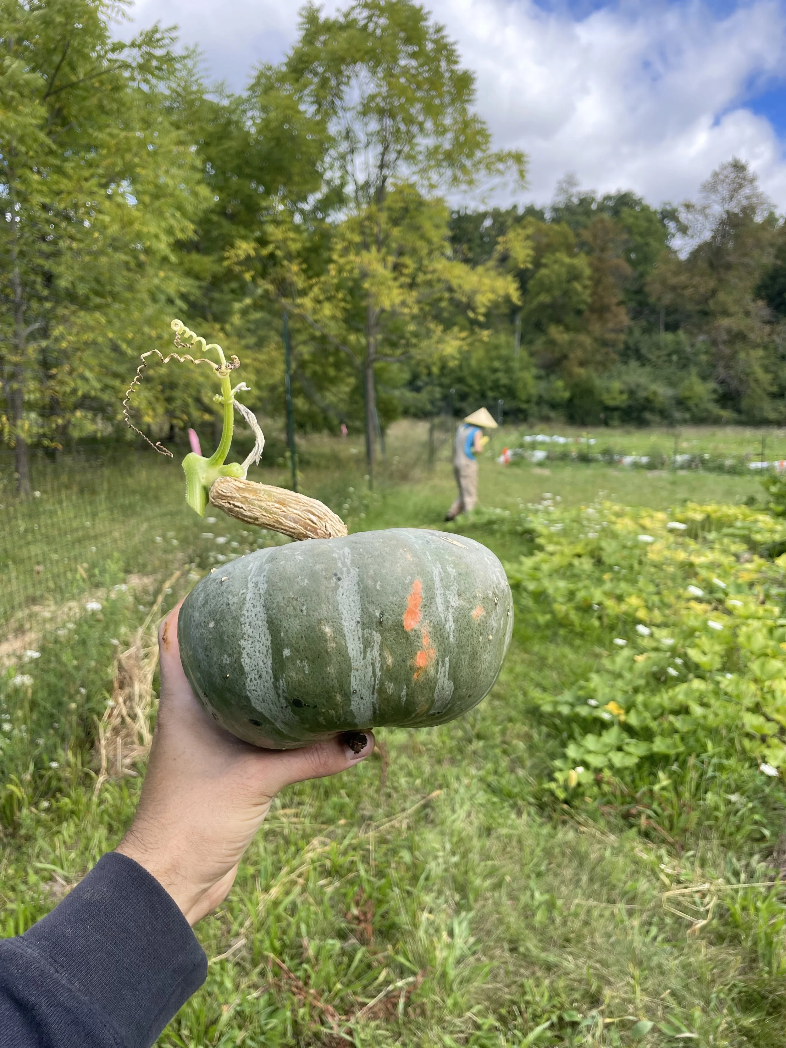A beautiful winter squash I plucked a bit early. The stem is close to dried out and I was eager.