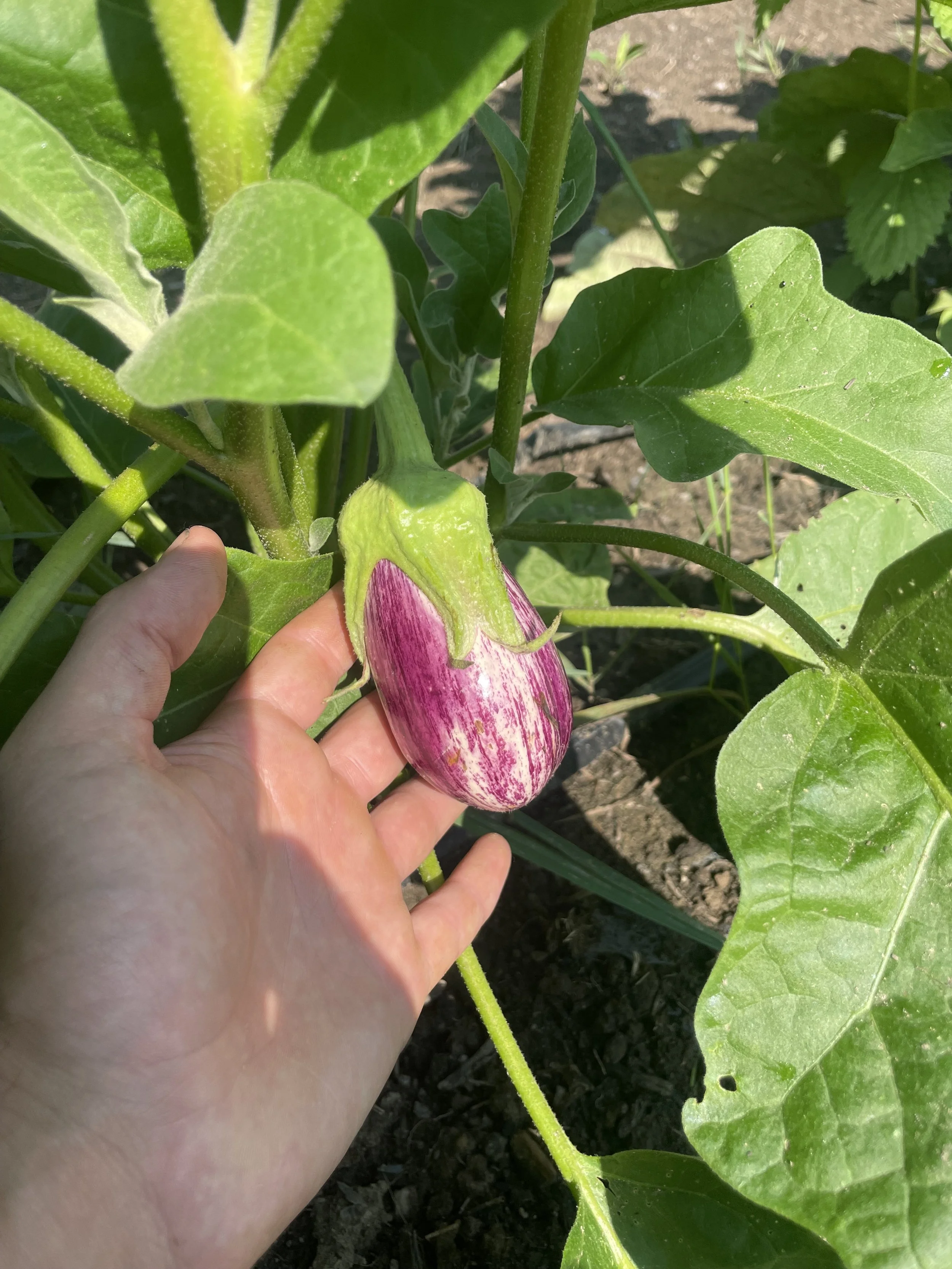 Our eggplant deserve a little bit of the spotlight as well. We are growing a variety called Annina. It is an Italian eggplant with purple and white stripes. It is excellent in pasta dishes and we especially love to make eggplant parmesan with it. The plants themselves are large and resilient. They are particularly productive as well. We should have a few of these available at market soon.