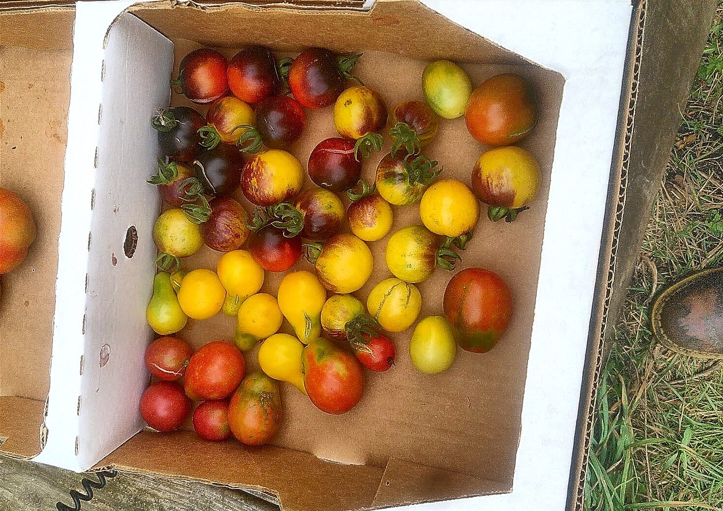 Fast forward to us planting in the field and not having a clue what to call the plants we were putting in the ground. I will admit that I was a bit concerned using a bunch of untested tomato varieties for our first season growing on this land. But now that they are all coming in I am excited to taste them all and decide which ones we like best. We hope that ya’ll will be willing to share your opinions on these tomatoes with us. There is a plethora of shapes and sizes, ranging from large multi-colored heirlooms to pear shaped cherries. Hopefully, a little something for everyone.